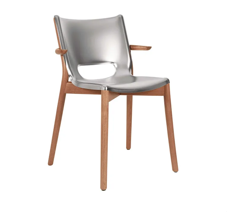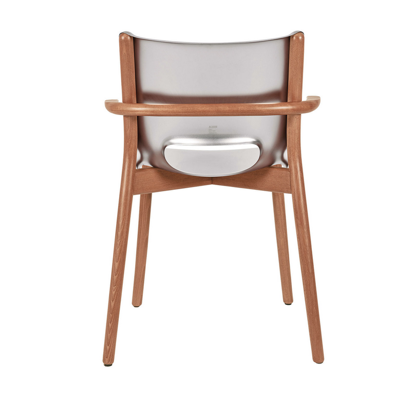 Schalenstuhl mit Armlehnen aus mattem Edelstahl, Gestell und Armlehnen Buchenholz braun getönt B 56 x L 53.5 x H 81 cm Ausstellungsmodell mit leichten Gebrauchsspuren