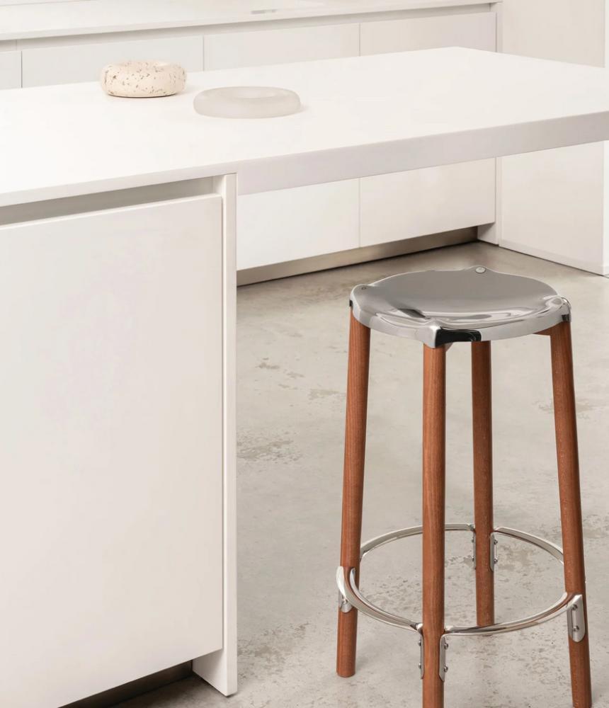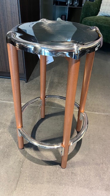 Barhocker aus poliertem Edelstahl, Gestell Buchenholz braun getönt Höhe 65 cm, ø 44 cm Ausstellungsmodell mit leichten Gebrauchsspuren