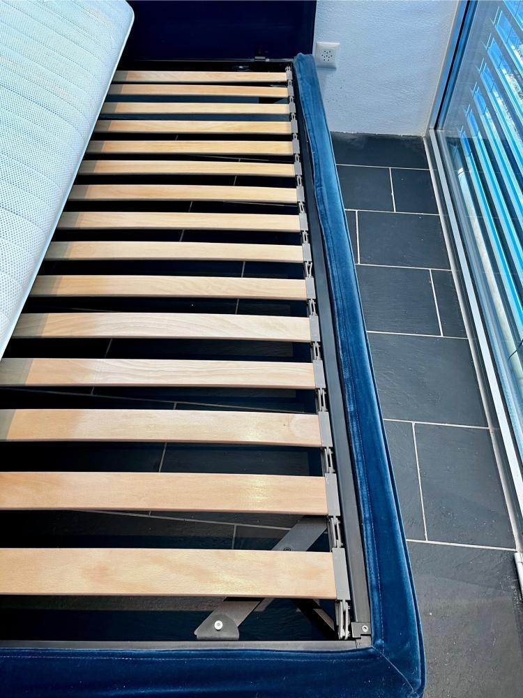 - Design Bett-Gestell Suite von Bernhardt & Vella für Arflex entworfen - Füsse schwarz lackiertes Metall - Bettrahmen mit blau/türkis Samt-Stoff - Metallbettrahmen - Theoretisch inkl. Buchenlatten, neue empfohlen, ohne Matrazen - Bezahlung Twint, Bar - Abholung in 5708