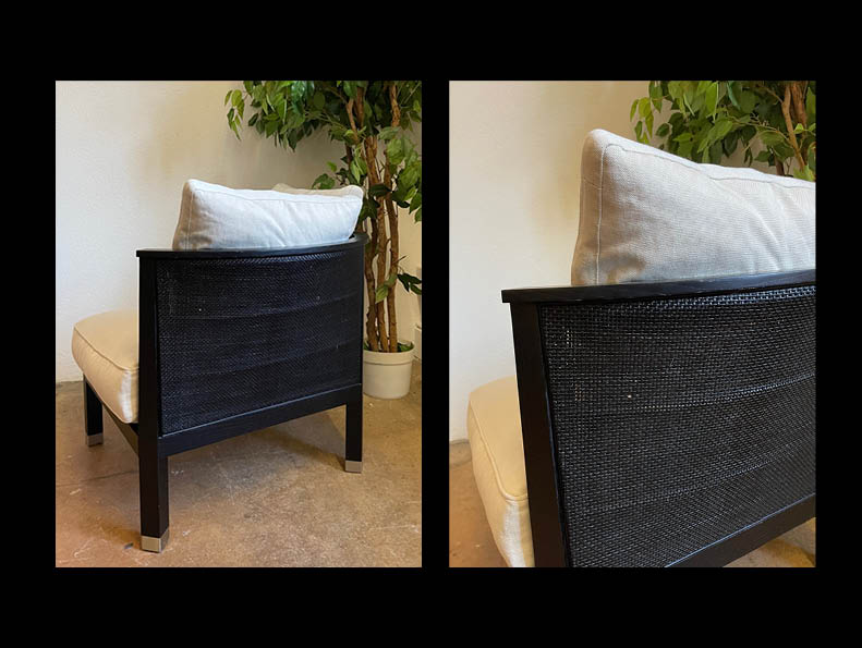 Arm- und Rückenlehne bilden eine gemütliche Ecke, die zur Entspannung einläd - Gestell & Geflecht Eschenholz ebenholzfarbig, Sitz- & Rückenkissen mit abnehmbarem Stoffbezug im Farbton offwhite bezogen - Grösse B 75cm, T 75cm, H65cm, SH 40cm - Ausstellungsobjekt - > Selbstabholung oder Lieferung; Kosten nach Vereinbarung - Dieses Modell kann nach Terminvereinbarung besichtigt werden. Teilen sie uns ihren Wunschtermin mit.